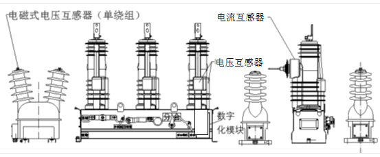 相测量PT、测量/保护CT分别封装于三个极柱中,零序电流、电压通过物理合成方式获得,相序/零序的电压/电流信号通过数字化模块就地转换为数字信号传输至馈线终端,不限制相测量PT、测量/保护CT的尺寸,但需满足相关技术参数要求,且不影响开关设备性能。结构如图3-12所示。